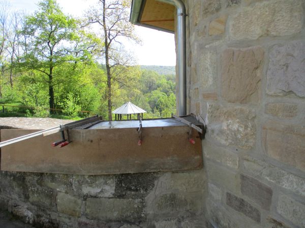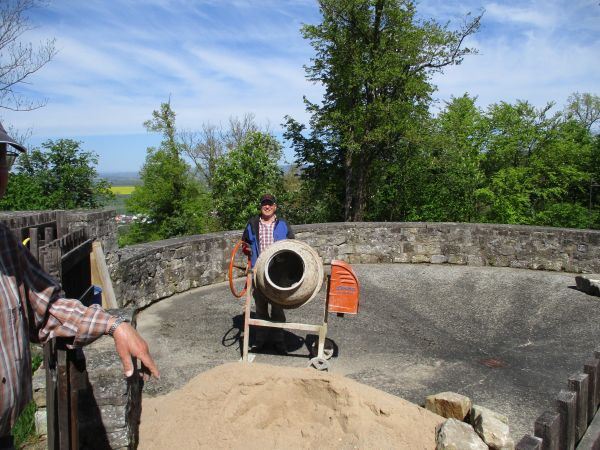 Am heutigen Arbeitseinsatz wurde die Baustelle auf dem Seckendorffturm mit weiteren Baumaterial bestückt. So wurde unter der Woche schon eine große Schaufel voll Sand für die Maurerarbeiten am der Brüstung des Turmstumpfes gebracht.