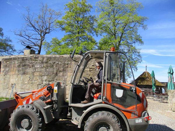 Aus dem Lager im Wallgraben unter der Brücke wurden mittels Radlader mehrere Schaufeln voll Sandsteine in den Burghof zum Seckendorffturm gefahren.